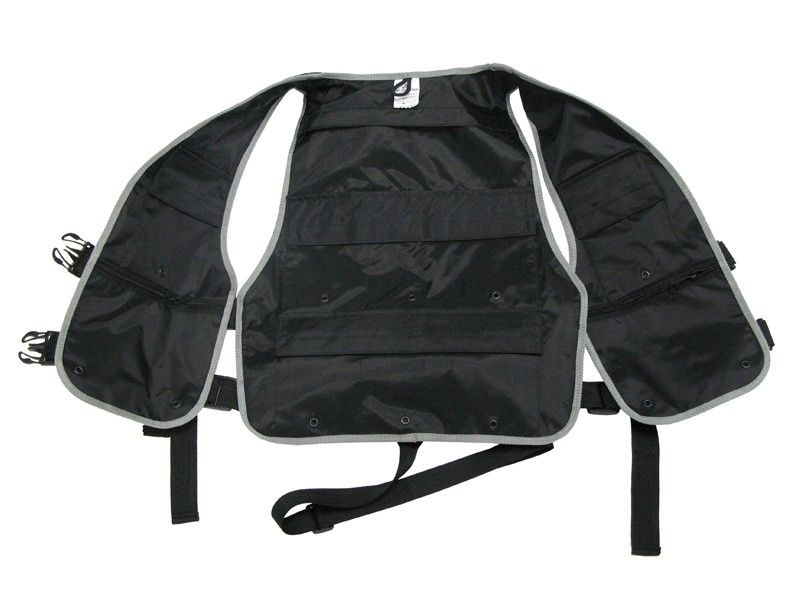 Šī veste ļauj ievietot līdz 8 standarta izmēra svara plāksnēm tās kravas kabatās.