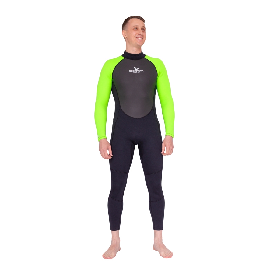 The lower front and back parts of the wetsuit and knee panels are made of thicker 3mm neoprene and are protected by a textile coating on both sides. The sides of the wetsuit, sleeves, collar, pants below the knees and crotch are made of thinner 2mm neoprene for greater elasticity to make the suit more tightly fit the figure and keep warm without restricting movement.
