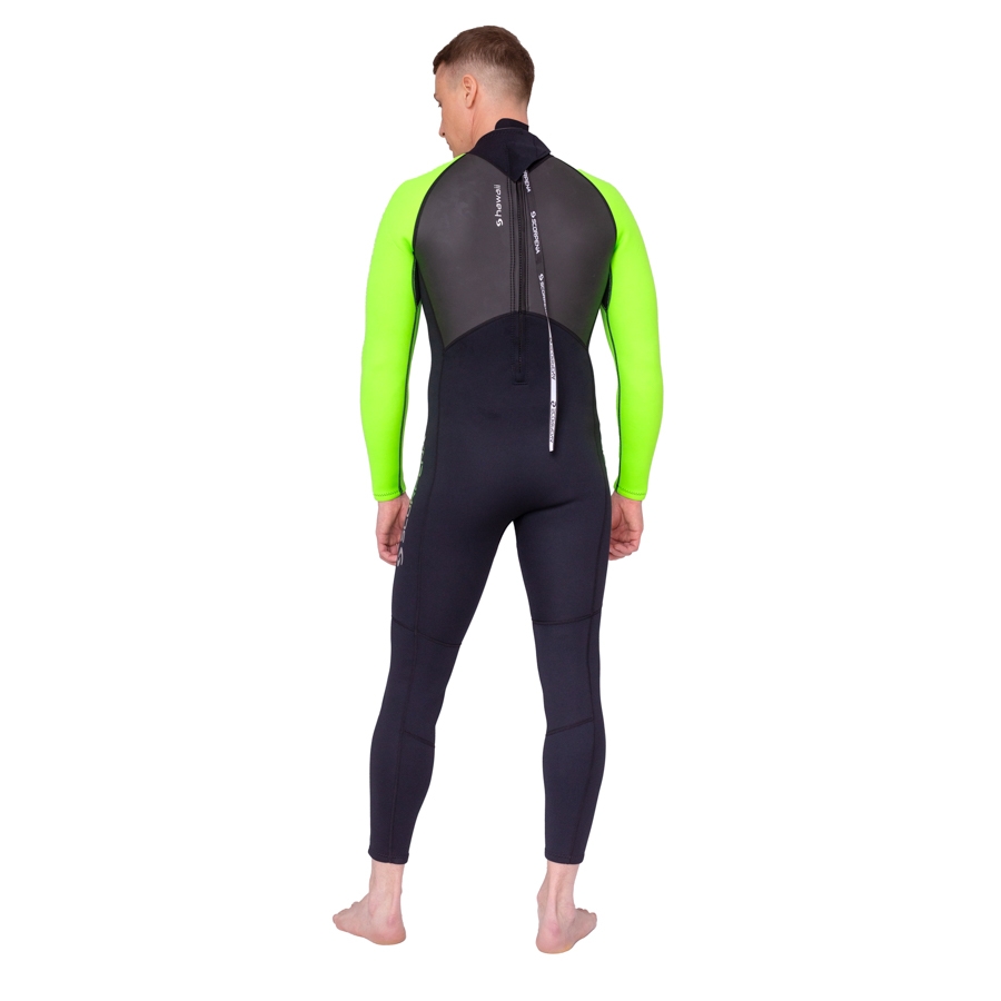 The suit is fastened with a vertically placed plastic zipper on the back, which is corrosion-resistant in salty seawater. For convenience, the zipper pull tab is equipped with a long loop with a textured surface.