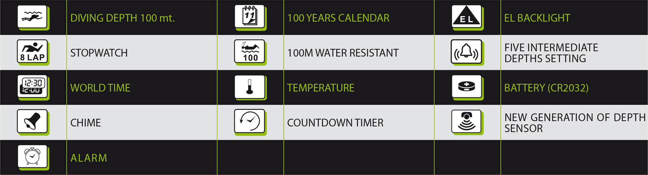 Dive modes are equipped with sound and vibration alarms, which is an