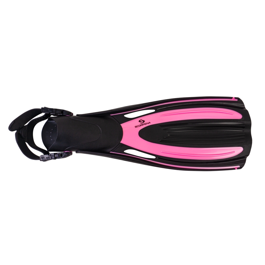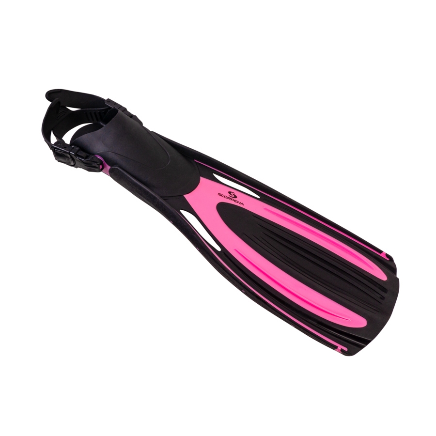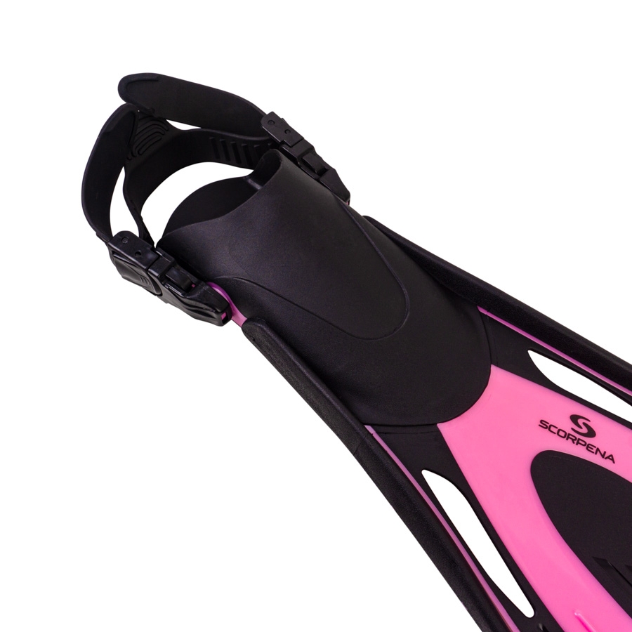 Scorpena Tahiti fins come equipped with a wide rubber strap that comfortably secures the foot in the fins. The strap attaches to the foot pocket using large plastic buckles. These buckles can be quickly undone to remove or put on the fins. Additionally, you can easily adjust the strap’s length for a comfortable fit on your foot. The buckles freely rotate at their attachment points, enhancing comfort while swimming with Scorpena Tahiti.