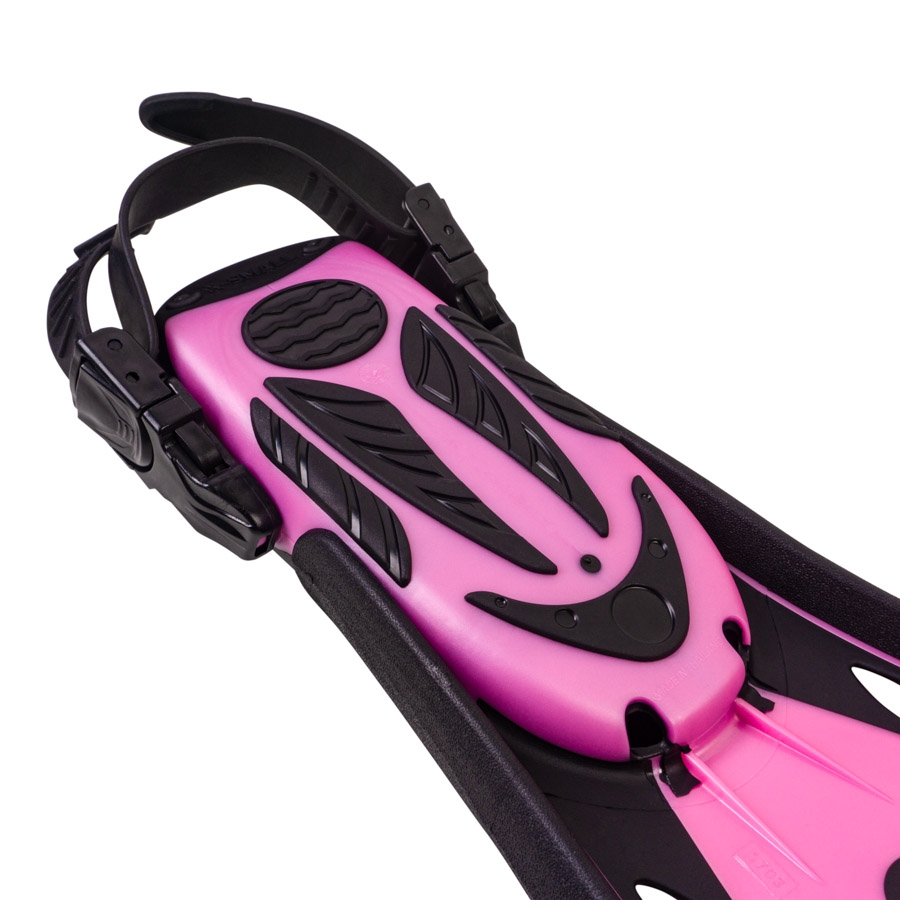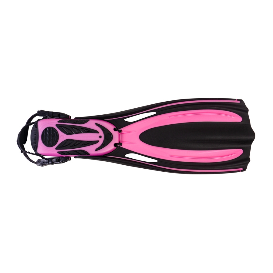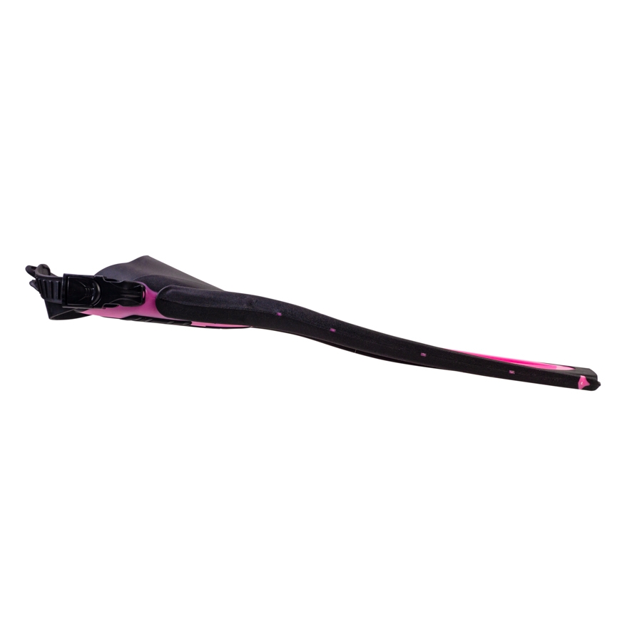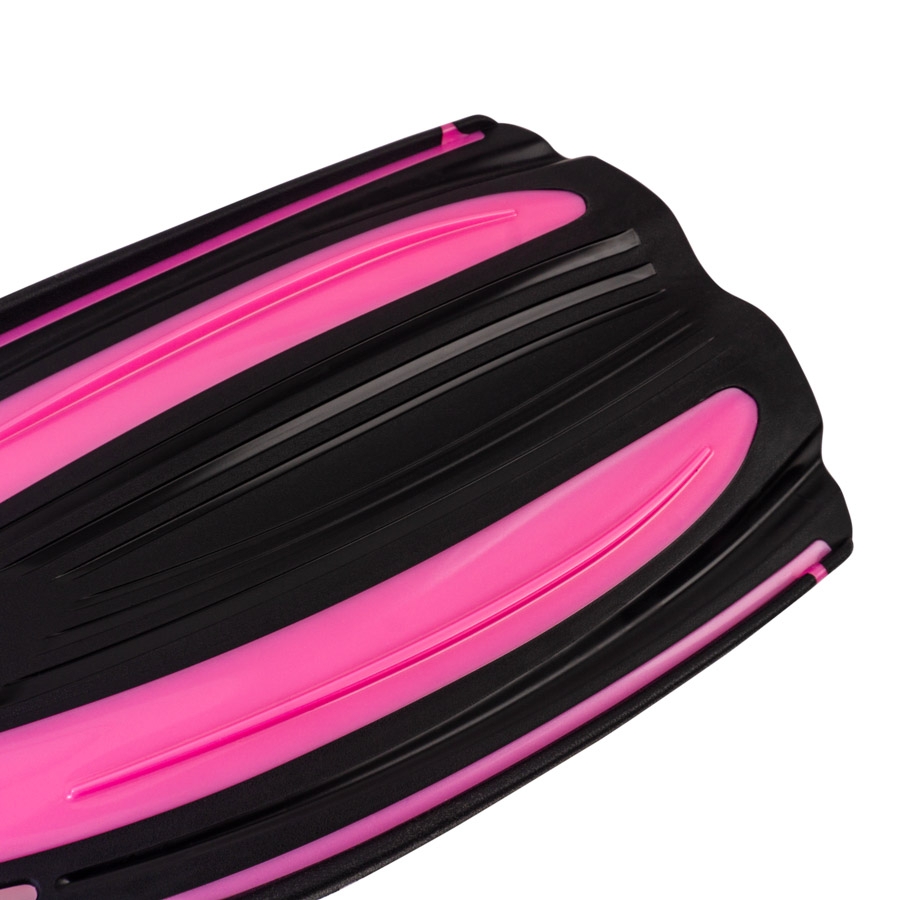 The fin blade is made of two different materials, enhancing flexibility, comfort, and delivering a high level of propulsion. The central part of the blade, made from elastic rubber, forms a tunnel during the stroke, preventing water from flowing into the low-pressure zone (on the reverse side of the blade) through the side edges. This directs water towards the end of the blade, increasing the power of the stroke while reducing energy loss—a design referred to as the “tunnel effect.”